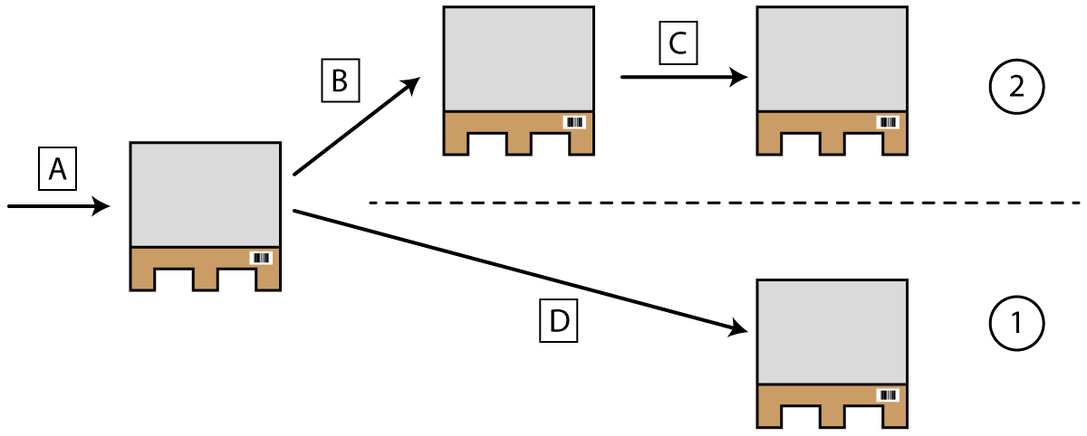 - 1 step receipt or blind receipt (1): You receive the goods concerned and Objective WMS searches for the matching purchase order data (D).